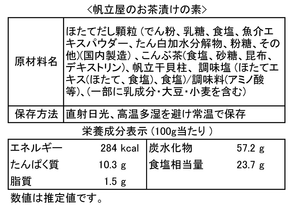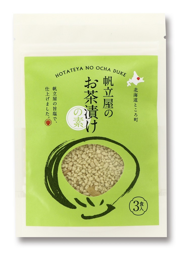 魚介だしを「帆立屋の旨塩」で整え北海道産の帆立干貝柱のほぐし身を加えたお茶漬けの素です。