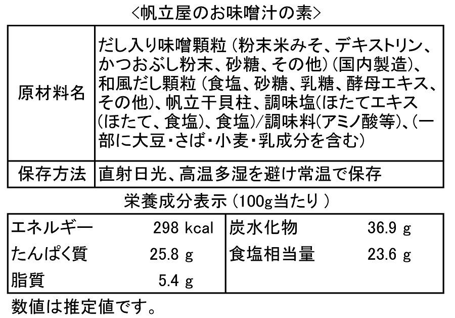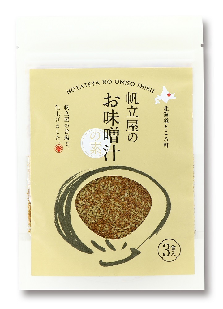 和風だしの効いた米みそを「帆立屋の旨塩」で整え北海道産の帆立干貝柱のほぐし身を加えたお味噌汁の素です。
