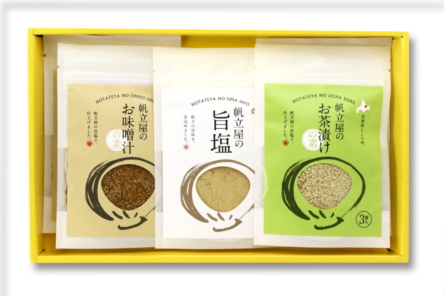「帆立屋」の旨塩にお茶漬けの素とお味噌汁の素を詰合せたシリーズセットです。ご家庭用から贈りものまで幅広くご活用ください。