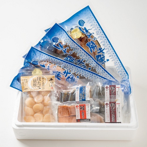 冷凍帆立貝柱(120g)×1、ほっけ開き×1、なめたカレイ一夜干し×1、さんまの紅茶煮×1、鮭山漬け(2切入)×1、銀だら(醤油味)×2、の詰め合わせセットです。