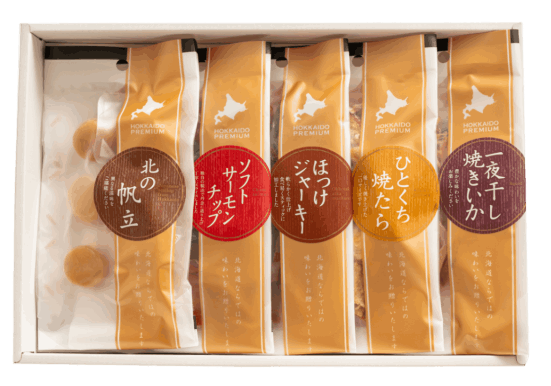 北海道産すけとうだら・いか、羅臼産の鮭、稚内産のほっけ、北海道産食材を使った5種類の味わいをお楽しみください。 ソフトサーモンチップ(40g)、ほっけジャーキー(50g)、一夜干し焼きいか(30g)、北の帆立(6粒入)、ひとくち焼たら(40g)/各1