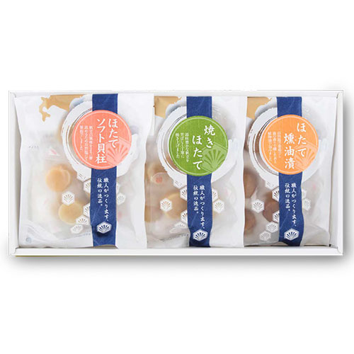 ほたて燻油漬・ほたてソフト貝柱・焼きほたての3種の人気セット詰合せです。