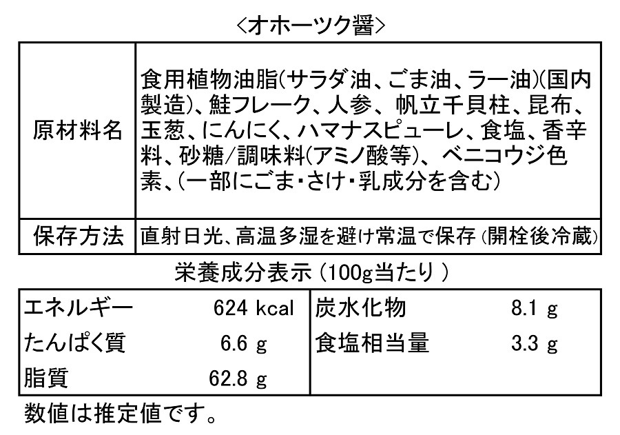 オホーツク産の帆立、鮭、ハマナスの実など、素材を贅沢に使いXO醤風に仕上げた濃厚な旨味と香ばしい香りが特徴の究極のオホーツク流旨味調味料です。