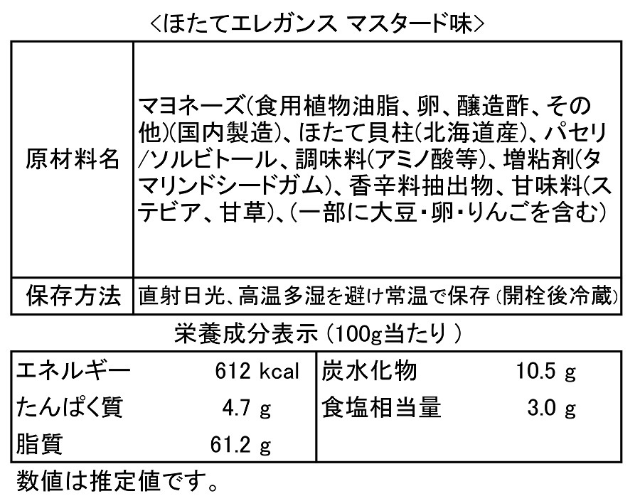贅沢にたっぷり入った、ほたて貝柱とマヨネーズとの絶妙な味わいの「ほたてエレガンス」が、おしゃれな瓶ボトルに入って新登場。ほたて&マヨのおいしさを食卓でお楽しみください。