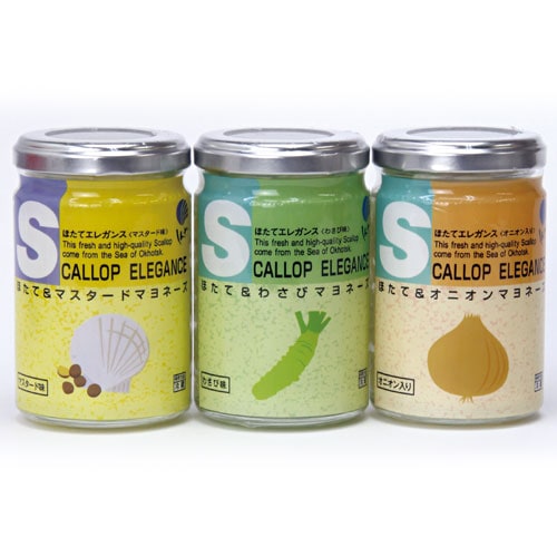 贅沢にたっぷり入った、ほたて貝柱とマヨネーズとの絶妙な味わいの「ほたてエレガンス」。 マスタード味、マスタード(オニオン入り)、わさび味の3種類。ほたて&マヨのおいしさを食卓でお楽しみください。
